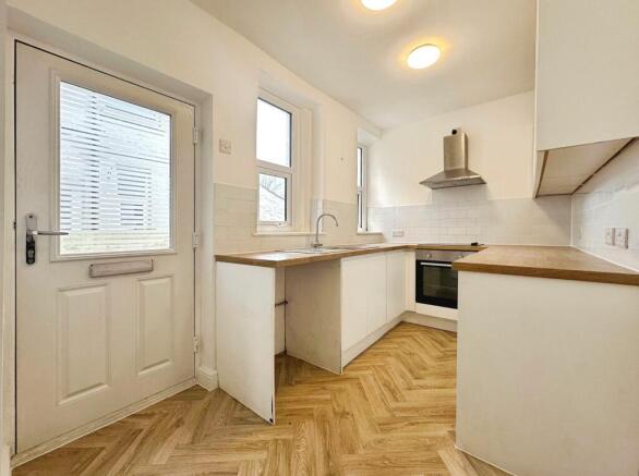 uPVC double glazed window to the side elevation. uPVC double glazed door leading to the rear yard. Modern fitted kitchen with Wooden working surfaces accommodated with gloss cupboard doors. Oven, grill and hob. Extractor fan. Stainless steel sink with drainer. Space for a washing machine and tower fridge freezer. Built in storage cupboard underneath the stairs. Partial white tiling. Power points. Two ceiling light points. *KITCHEN FLOOR TO BE INSTALLED*