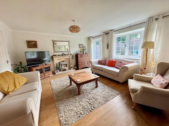 LOUNGE/DINER 18' 2" x 16' 3" (5.54m x 4.95m) A stylish and spacious living room with feature fireplace and modern contemporary fitted fire, bay window and French doors leading to the rear garden. Radiator and Amtico flooring.