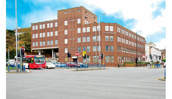 This prominent corner office building is located in the professional quarter of Wolverhampton City on Waterloo Road.