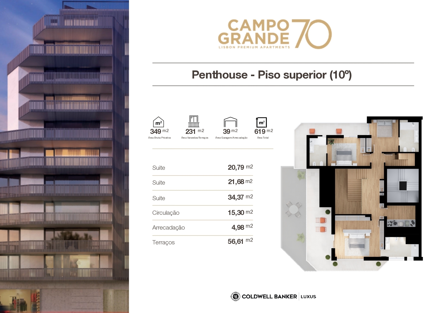 This fabulous Penthouse with premium finishes occupies the entire upper floors of the Campo Grande 70 building, encompassing the 9th floor, the 10th floor and the entire Rooftop (roof of the building).