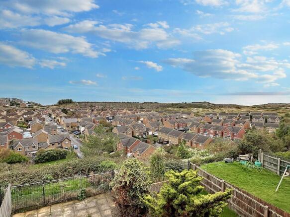 The rear garden has an initial area of slabbed patio with a lawn bisecting path leading to a final raised patio to afford the channel views. There are several trees and planted borders and an outside tap.
