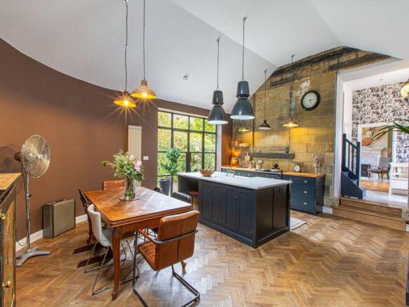 The deVOL kitchen is a true centrepiece, an extension of the original building and decorated in a bold yet refined palette of contrasting neutrals and luxurious deep brown tones. Industrial-style pendant lighting hangs above the quartz countertop featured on the island, adding drama and atmosphere, while wooden worktops along the perimeter balance warmth with practicality. Antique brass hardware, smoked, solid oak parquet flooring, and a high vaulted ceiling enhance the sense of timeless elegance and craftsmanship. This striking space has been designed for both function and style, with Crittall-style doors opening directly onto the south-west facing garden, ensuring the room is always filled with natural light and a seamless flow to the outdoors. A separate shaker-style utility room and W/C provide additional practicality while complementing the home's character.
