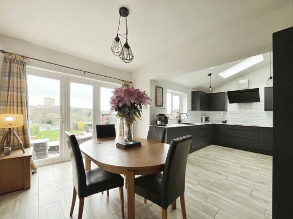 The front living room, currently utilized as a pool room, features a bay-fronted window, offering ample natural light and a picturesque view of the surroundings. The second reception room serves as the main living space currently, accentuated by a feature log burner, creating a cozy atmosphere perfect for relaxation. This area seamlessly flows into the dining and kitchen space, the heart of the home. The recently fitted kitchen is equipped with modern appliances, complemented by bi-folding doors opening onto landscaped patio areas, providing breathtaking views of Conisbrough Castle. Velux skylights further enhance the ambiance of this inviting space.