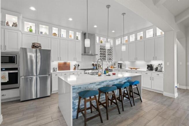 Welcome to The Colony, a gated master-planned community offering pools, pickleball courts, fitness center, parks, trails, and dog parks. This completed, fully upgraded home offers what today's new builds often lack: turn-key finish-out, designer selections already made, and a finished outdoor living and pool environment ready to enjoy on day one. No construction delays, no additional cost layers, and no waiting for landscaping or patios to mature - it's all here. Designed for everyday comfort and effortless entertaining, this single-story home offers approx. 2,904 sq. ft. (buyer to verify) with 3 ensuite bedrooms, dedicated office, media room, and a 3-car tandem garage with storage. Built in 2022 on a .291-acre lot backing to the community trail system, with four-sides masonry and modern architectural lines. The great room features a vaulted beamed ceiling, gas fireplace with custom pecan mantle, and a 5-panel accordion glass door that blends indoor and outdoor living. The chef-inspired kitchen includes a quartz waterfall island, farmhouse sink, Thermador 6-burner gas cooktop and vent hood, under cabinet lighting, extended glass-front cabinets with puck lighting to the ceiling, wine niches, stainless built-ins, a wine refrigerator & soft close cabinets/drawers with pulls, all open to the Dining & Great room. The primary suite offers views of the backyard pool, while the spa-style bath features a freestanding soaking tub with custom pecan ledge, frameless walk-in shower with Carrera Morro tile, skylight, and dual vanities. Step outdoors to a complete entertainment retreat: a vaulted covered patio with built-in outdoor kitchen, terraced stone patios, firepit area, and a heated pool and spa with sun-shelf/beach ledge. The built-in umbrella and in-pool lounge chairs convey, ensuring immediate enjoyment. Additional upgrades include Ring camera system, blown-in insulation, full irrigation, and wrought iron fencing. A rare opportunity to move right in and live well!