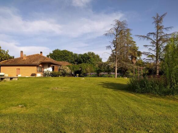 The surrounding grounds extend over approximately 1 hectare of completely flat land, adorned with majestic cedar and weeping willow trees. Around 5,000 sqm of manicured lawn encircle the house within the fenced area, while beyond the enclosure lies an olive grove with about 40 productive trees and a paddock with a stable, currently home to a horse.