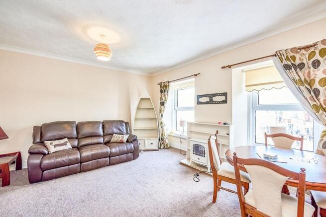 0 x 0 - Large open room with 2 large windows to front. 2 seater leather sofa and 3 seater leather sofa. Electric fire place. Dining table with 4 chairs.