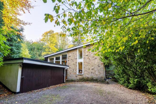 Stepping through the entrance hall, you are greeted by a stylish kitchen and dining area that perfectly blend modern finishes with the home’s mid-century charm. The kitchen showcases an elegant, contemporary design, fitted with attractive wall and base units, complemented by sleek countertops and a practical dining island. An arched alcove with built-in shelves add character and storage, while the kitchen itself features high-quality integrated appliances. A convenient utility room adjoins the kitchen, while the open dining area offers an ideal space for family gatherings and entertaining guests. From here, doors open out to a spacious balcony with scenic woodland views. The ground floor also features a study with serene outlooks, a practical store room, garden store, and a convenient WC. Ascending to the first floor, you’ll find the main living and dining areas, boasting stunning slanted wooden panelled ceilings and a captivating double-sided log burner. Large windows flood the space with natural light, connecting the interior with its lush surroundings. A charming garden room, surrounded by windows, completes this tranquil level, offering an immersive connection with nature.