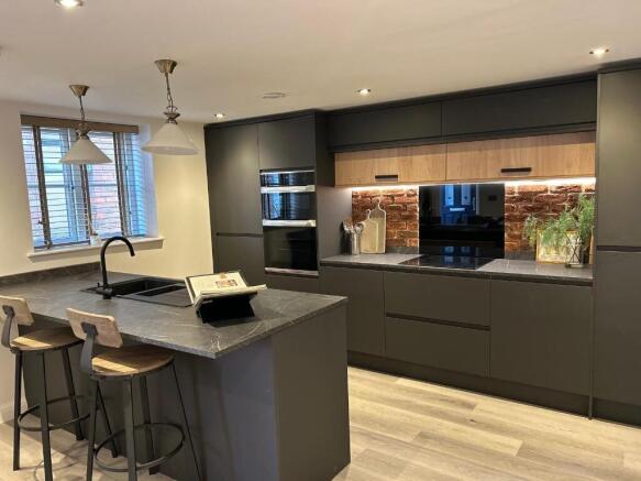 The heart of the property features a high-specification kitchen with sleek matt-black cabinetry, marble-effect worktops, integrated appliances, double oven, induction hob, and stylish lighting. The open layout includes a breakfast island and bar seating, creating an ideal space for shared cooking, dining, and socialising.