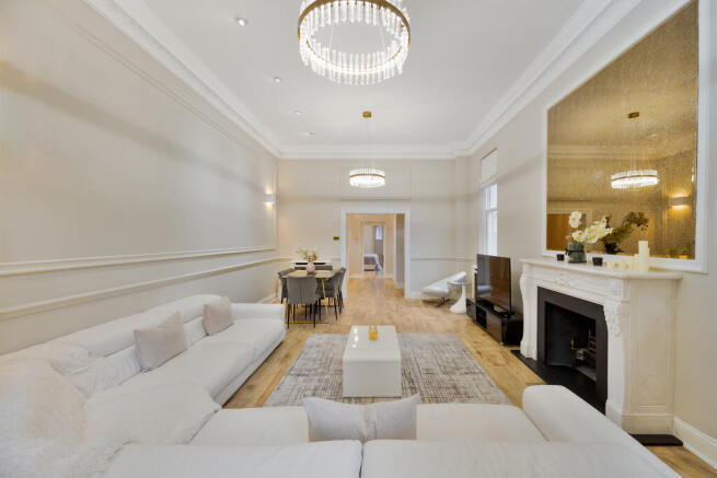 On the raised ground floor, a wide entrance hallway leads through to an impressive reception room stretching more than twenty-five feet. Soft natural tones, ornate cornicing and twin chandeliers set a refined backdrop for both dining and entertaining, while a bank of large windows draws in morning light. A separate kitchen sits alongside, fitted with ample storage and a run of worktops that make the space both practical and easy to use day to day. This level also contains a third bedroom, currently presented as a bright double room.
