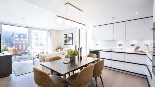 This bright and spacious home features an expansive open-plan reception and dining area with access to a private balcony, perfect for relaxing or entertaining. The fully integrated kitchen is equipped with top-end Siemens and Miele appliances, including an oven, induction hob, large fridge freezer, dishwasher, and wine chiller, all set within sleek composite stone worktops.