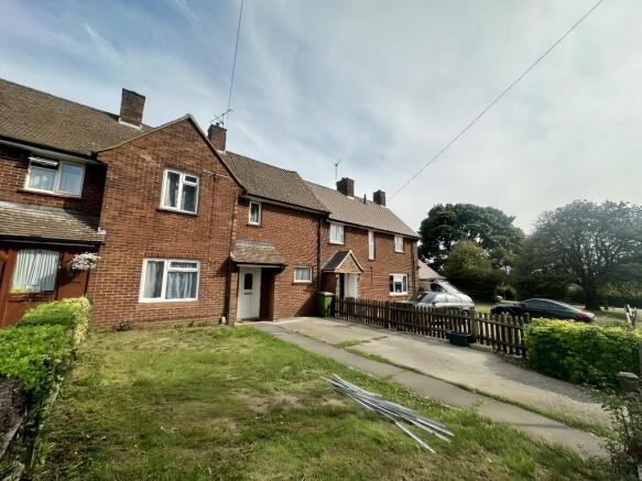 FRONT Driveway parking for two cars, large front garden laid to lawn