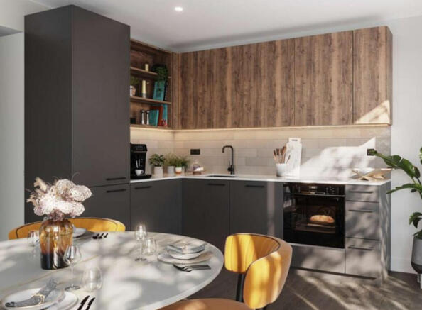 Inside the apartment, quality and attention to detail are evident throughout. The hallway, kitchen, and living room are finished with timber-effect flooring, while the bedroom is fitted with soft carpets for added comfort. The feature front entrance door is equipped with a high-security multi-point locking system and spy hole, complemented by matt black ironmongery throughout the home. A freestanding washer/dryer is neatly housed within a hall cupboard, and the apartment is fitted with electric panel heaters and a Mechanical Ventilation Unit with heat recovery to ensure efficient comfort year-round.