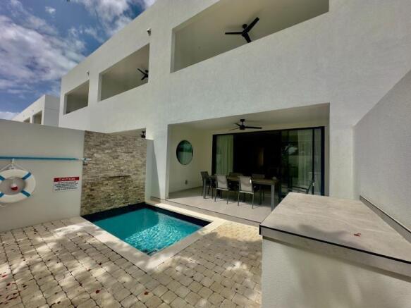 Outdoors, enjoy your private plunge pool and landscaped terrace — perfect for relaxing under the tropical sun or entertaining in style. The property also includes private parking for two vehicles and the peace of mind within this well-maintained community.