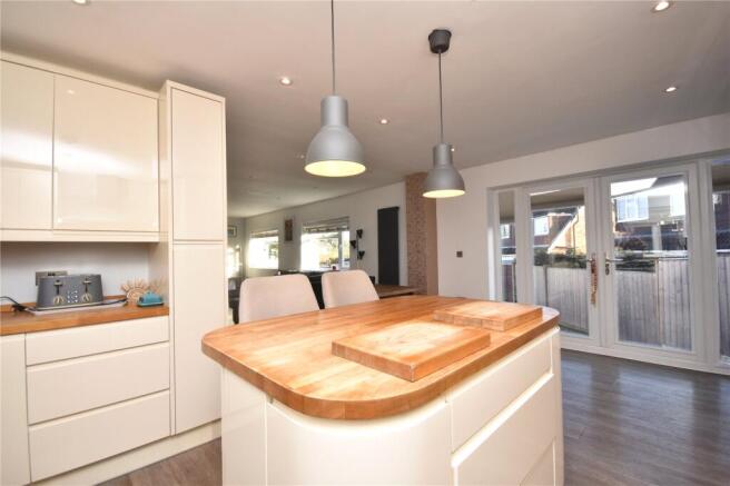 A welcoming entrance porch leads into a bright hallway with staircase rising to the first floor. To the rear, a superb open-plan living space spans the full width of the property, incorporating a spacious living room and an impressive dining kitchen. This extended area is ideal for modern family living, featuring a sleek range of re-fitted wall and base units with solid oak worktops, centre island/breakfast bar, space for a range cooker, American-style fridge/freezer and integrated dishwasher. A separate utility room provides additional storage and laundry space, along with access to a stylish ground-floor WC.