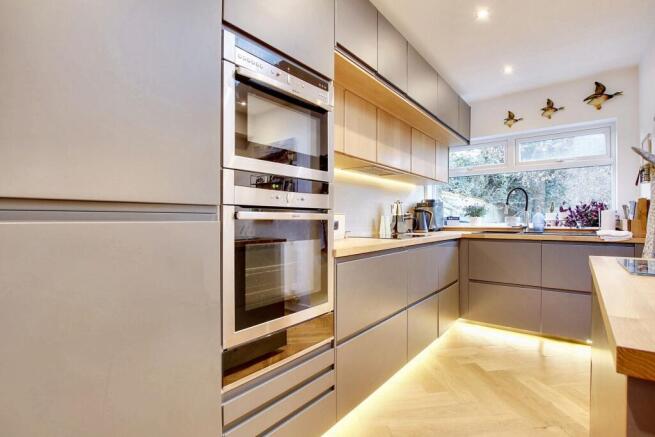 An open plan kitchen/ dining space. The snug area boasts a large picture window overlooking the rear elevation, with sliding door on the side leading out to a patio area. The room is heated by radiator, complemented by a composite wood flooring. Moving through an open archway, you enter the dining area, featuring double French doors leading to the sun patio, ideal for hosting gatherings year-round. Continuing from the dining area, you will find the kitchen, complete with a bespoke design and a lantern window offering ample natural light. The kitchen is equipped with a range of modern amenities including an island with drawers, built-in double oven, microwave, warming drawer, integrated fridge/freezer, and comprehensive storage cupboards in a light grey and wood finish. Moreover, the kitchen features solid wood work surfaces, a composite sink with a mixer tap, induction hob, extractor hood, and dishwasher. The consistent flooring throughout ties these spaces together seamlessly.