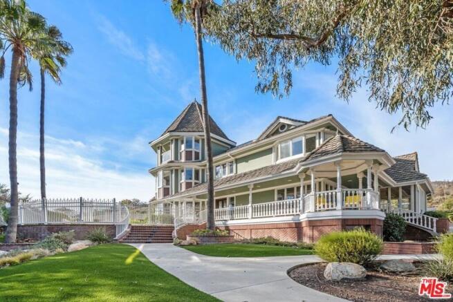 A stunning 4 BR 6 BA hilltop home, with approx. 4,273 SF of living space & generous 33,542 SF lot zoned for Equestrian. The primary & 3 additional en-suite bedrooms provide ample closet space and privacy. Ground level includes a spacious kitchen with Thermador Double Oven & cooktop, Bosch Dishwasher & SubZero refrigerator. Enjoy family around the kitchen island & adjoining breakfast nook, perfect for casual dining. Also included, a powder room, formal dining area & living room with fireplace leading out to the pool & guest en-suite with access to the backyard patio. On the 2nd level you will find the primary en-suite BR with huge walk-in closet, the 3rd en-suite BR and a powder room for guests. This main living space is well-designed for entertaining, including a sitting area, wet bar & large living room with fireplace & dual sliders leading out to a sundeck & spiral staircase down to the pool. The top-level turret includes the 4th en-suite BR with walk-in closet & private balcony, fireplace & panoramic views. The basement has a private entrance & storage, includes two rooms & sauna, ideal for a home office & separate bonus room, catering to various lifestyle needs. A large wraparound front porch adds to the home's welcoming atmosphere. Outdoor features include a private pool, spa, horseshoe pit and outdoor fireplace, perfect for year-round enjoyment. Solar panels with battery backup help power the home, & drought-tolerant landscaping with drip irrigation promotes water conservation. A 200-foot private driveway leads up to the Victorian-style residence. The property is situated on a hilltop, offering panoramic views of the surrounding area, including the Santa Monica Mountains. The home is located near miles of hiking & mountain biking trails, providing ample opportunities for outdoor recreation. The home boasts a three-car garage with built-in storage lockers, 240-volt circuit for charging your EV, as well as a 26-gallon air compressor.
