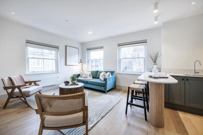 The flat boasts a separate living and dining area, highlighted by triple-aspect windows that flood the space with natural light, creating a warm and inviting atmosphere. The living area is thoughtfully furnished with sleek, modern pieces, making it perfect for relaxing or hosting. The kitchen, fully integrated with top-of-the-line appliances, is both practical and stylish, blending effortlessly with the open-plan design.