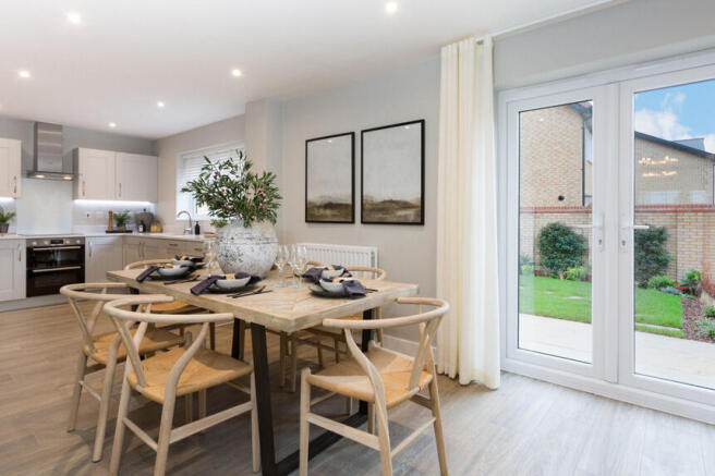 Home 257 - The Pembroke at The Green. This stunning four-bedroom detached home has been carefully designed to balance practicality and modern living. At its heart is the open-plan kitchen and family/dining area, fitted with a Symphony upgraded Elite kitchen door range and Bosch appliances, including an integrated fridge freezer, dishwasher, and washing machine. Under-cupboard LED lighting and a separate utility room add functionality. French doors connect the dining area to the garden, creating a natural flow between indoor and outdoor spaces.