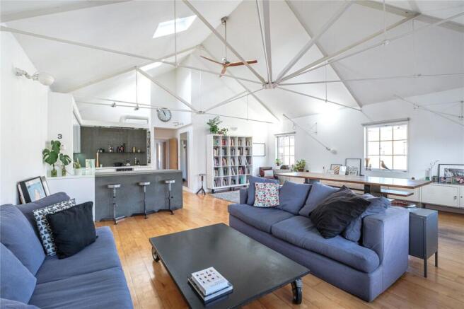 The open-plan area naturally zones into living and dining, comfortably accommodating large furniture pieces. Wall-mounted lights and window seats add character, while radiators and storage .are neatly built into the perimeter to preserve the clean architectural lines. A hallway leads to the bedroom wing