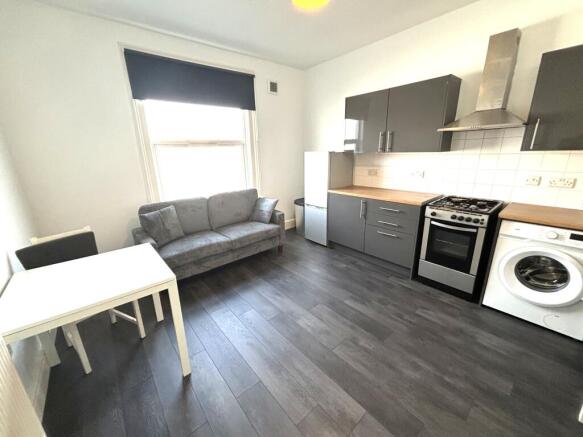 Open plan kitchen and living area with white goods. Double bedroom with wardrobes. White bathroom suite with shower.
