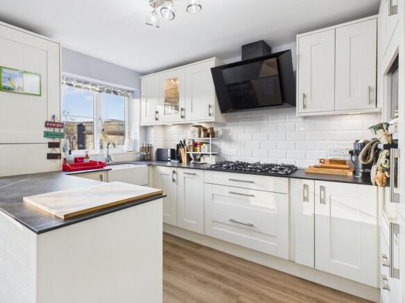 Entered under a storm porch, the ground floor comprises an entrance hall and cloakroom. The sitting room has a gas fireplace with brick surround and a useful under stairs cupboard. The kitchen has been re-fitted by the current owner and comes equipped with a range of units, an integrated fridge/freezer, dishwasher and an eye-level oven with separate five-ring gas hob and extractor. In addition to this there is also space for a washing machine, wine cooler and under counter fridge and a door into the rear garden.