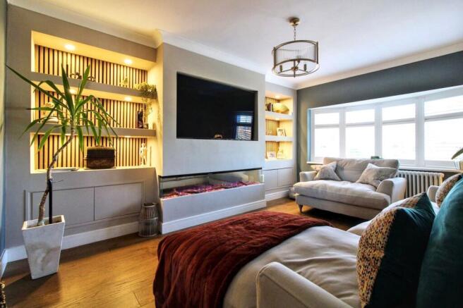 Double glazed bay window to front aspect complemented by Plantation shutters, bespoke media wall with recess lighting, inset remote control electric fire, feature wood panel wall, gas central heating radiator, oak laminate flooring;
