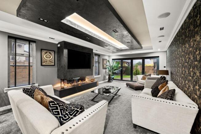 The main lounge has been designed with atmosphere in mind, featuring a bespoke Venetian plaster gas fireplace and a striking feature ceiling with ambient LED lighting. Full-width bifold doors open the room to the garden, flooding the space with natural light. A fifth bedroom on this level is currently styled as a playroom but would work equally well as a home office or snug. The entire ground floor benefits from underfloor heating, and the home is fitted with a Sonos speaker system and zoned smart lighting throughout, allowing for individually controlled ambience in every room.