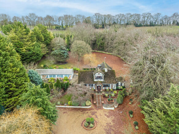 A detached home set behind gates on Delmer End Lane, occupying a mature and private plot with woodland surroundings, approximately 4.5 miles from Harpenden town centre and 5 miles from St Albans city centre. The property offers flexible accommodation including an annexe, outbuildings and a covered swimming pool, suited to a variety of living arrangements.