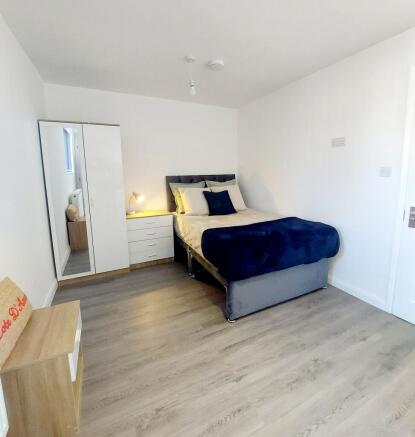 Comfortable double bed & mattress, wardrobe, bedside table and chest of drawers.