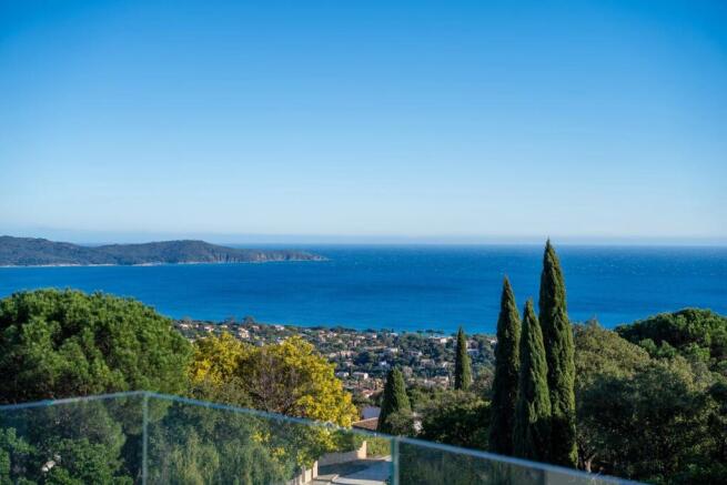 The living room is bathed in natural light thanks to large bay windows and multiple openings facing all directions. The view is breathtaking, overlooking the Bay of Cavalaire, Île du Levant, the beaches of Gigaro, Cap Lardier, and perhaps even an impromptu regatta.