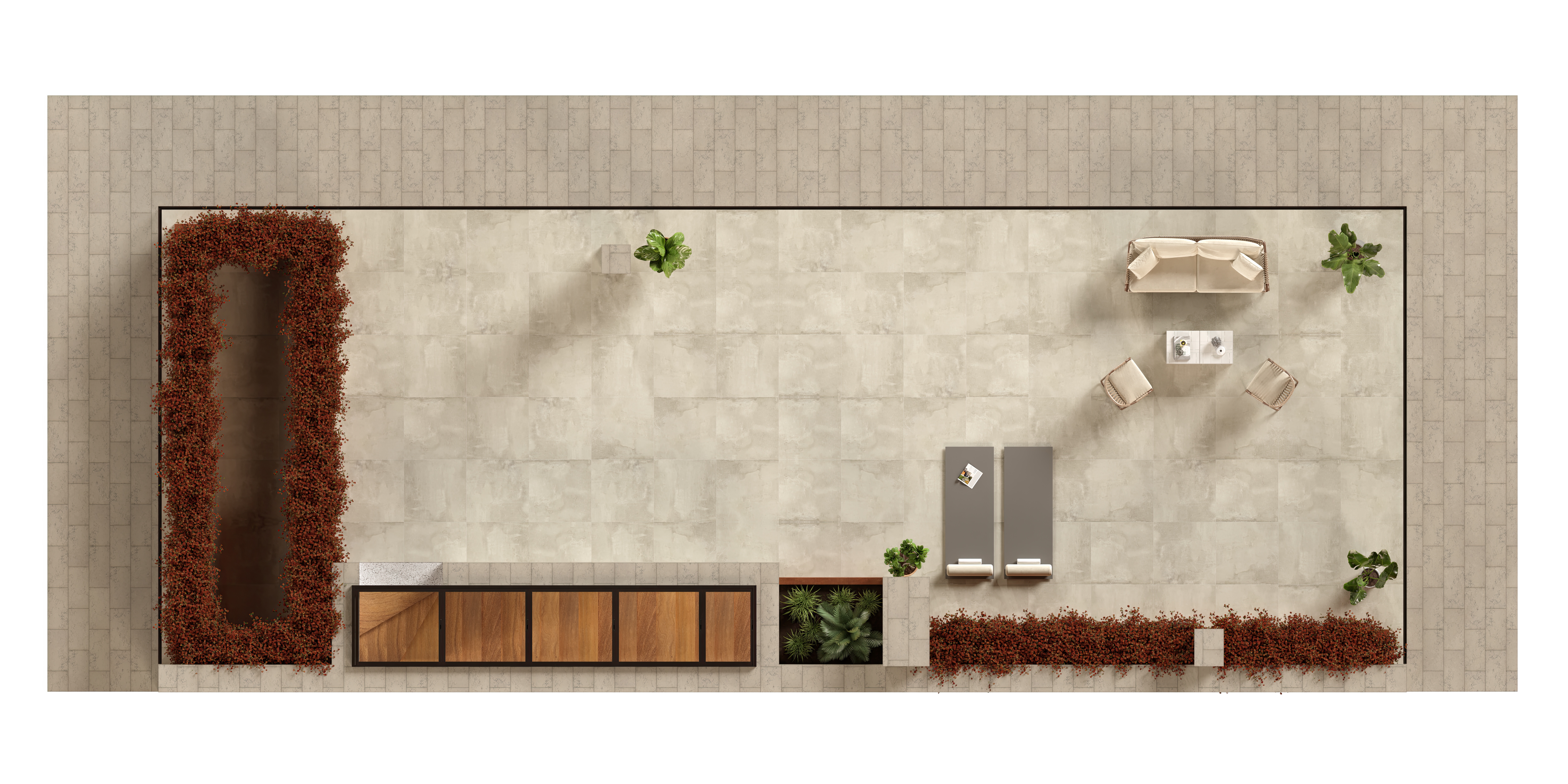Elegant lines and noble materials, such as Ataíja Azul stone, solid Cumaru wood and Porcelanosa tiles.