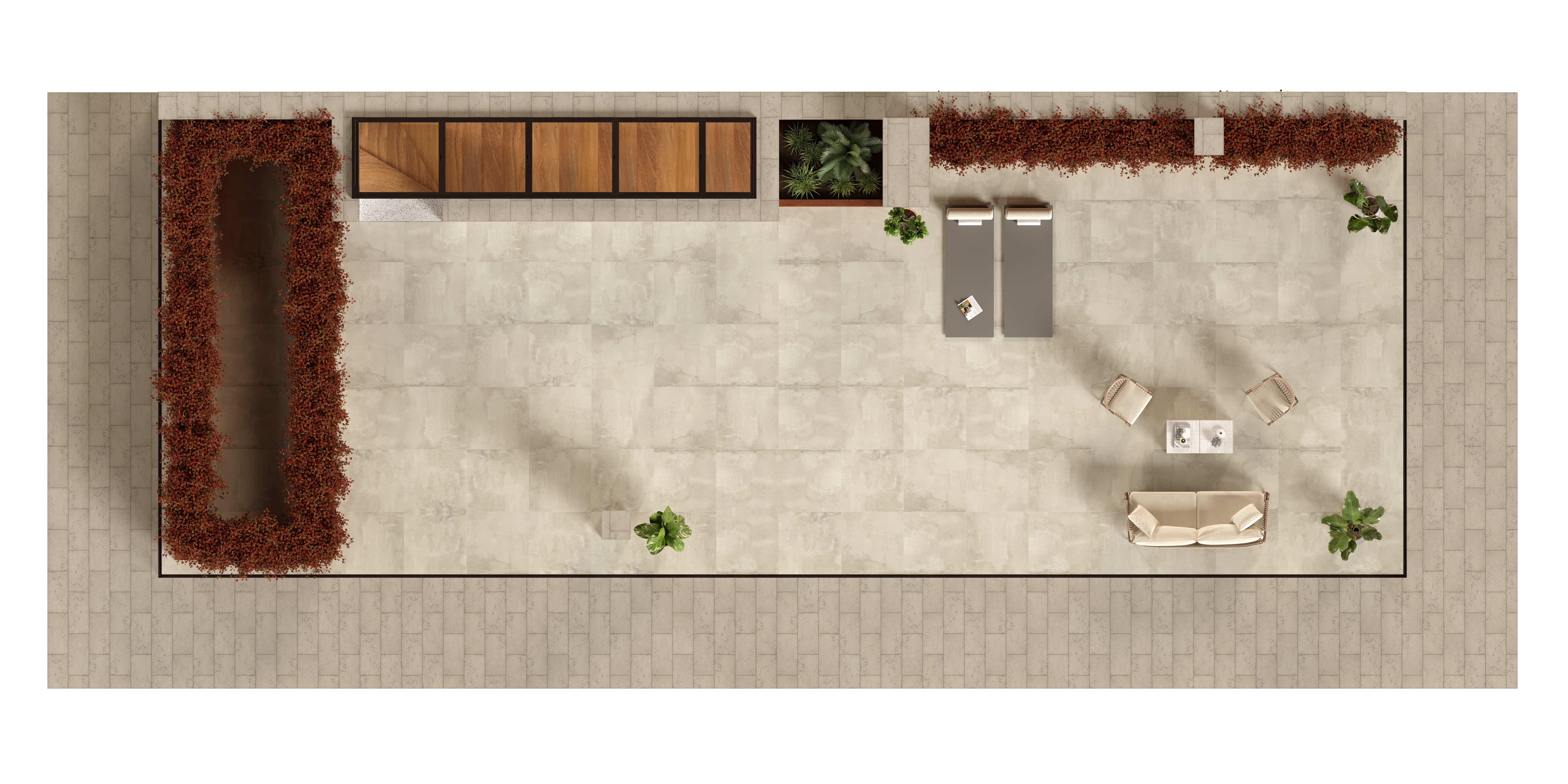 Elegant lines and noble materials, such as Ataíja Azul stone, solid Cumaru wood and Porcelanosa tiles.