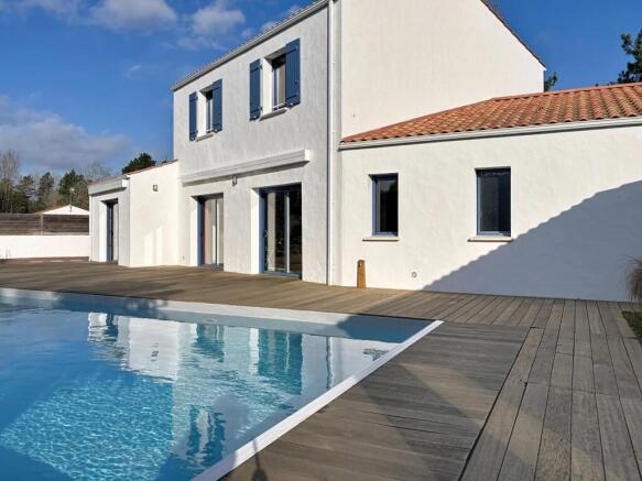 Outside, every space celebrates the Vendée way of life: an elegant swimming pool, a covered courtyard with a summer kitchen, a carport, a garage, and a tree-lined garden that exudes serenity.