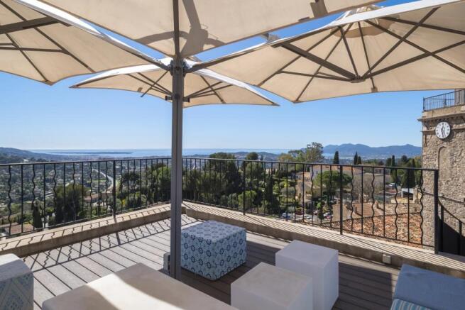 With approximately 100 m² of living space, the house was fully renovated in 2018 and features two en-suite bedrooms with views of the sea and the Lérins Islands, a kitchen/dining area, and a living room with views over the Mediterranean Sea and a close-up view of the village bell tower, reminiscent of a postcard setting.