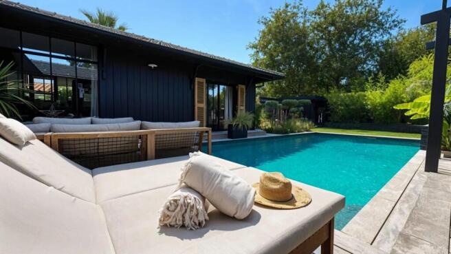 The spacious, light-filled living room opens onto a large covered terrace and a secluded swimming pool, surrounded by a fully landscaped garden, offering the perfect setting to enjoy beautiful days in complete serenity.