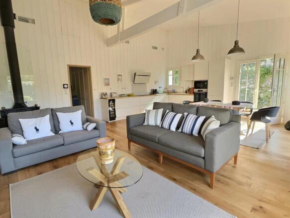 A living/kitchen area of approximately 50m2 under a cathedral ceiling with two sliding glass doors that open to the south-facing exterior.