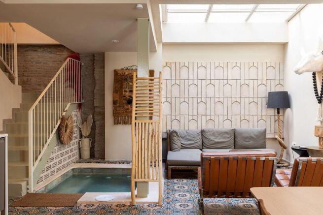 The property is arranged over two floors. The ground floor is organised around a central courtyard inspired by Andalusian architecture, where water once again plays a central role. In its current design, this space features an indoor jacuzzi beneath a retractable glass roof, which can be opened in summer and closed in winter, allowing the home to adapt to the seasons and offering an intimate, year-round experience.