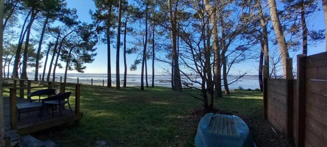 The property opens directly onto the beach, offering an exceptional waterfront lifestyle with stunning Bay views framed by the pine trees.