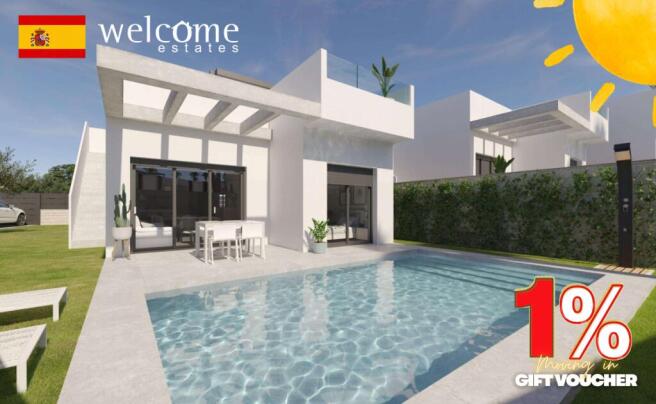 3 spacious bedrooms, 2 stylish bathrooms, open-plan living and dining area, fully fitted modern kitchen, high-quality finishes, private swimming pool, sunbathing terrace, large solarium with open views, landscaped garden, off-road parking, double-glazed windows, pre-installed air conditioning, fitted wardrobes, security door, modern tiling throughout, LED lighting, low-maintenance outdoor areas, gated residential community, south-facing orientation, walking distance to golf course and resort facilities, short drive to local amenities, 15 minutes to the beach, 35 minutes to Alicante Airport, perfect for permanent living, holiday use or investment, exclusive 1% Welcome Estates cash-back offer.