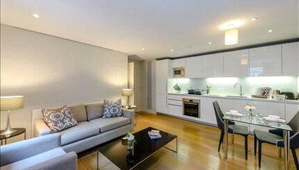 The apartment offers generous living and entertaining space, featuring a beautifully appointed reception room, a sleek modern open-plan kitchen, a well-proportioned bedroom, a contemporary bathroom, and ample built-in storage throughout.