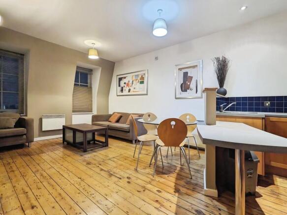 LIVING ROOM The living area is a bright and inviting space, enhanced by two large feature windows which allow plenty of natural light and add to the apartment's character. The room is furnished with a sofa and dining table, creating a comfortable area for both relaxing and entertaining.