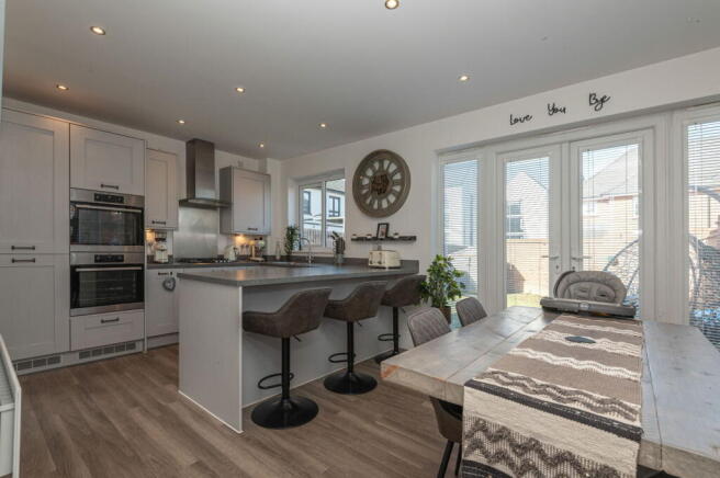 - Open-plan kitchen, dining, and living area perfect for family life and entertaining, with French doors opening to the garden.