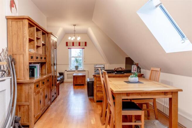 At the far end of the hallway, the apartment opens into a truly impressive living / dining room, a beautifully shaped space featuring vaulted ceilings, character angles and large windows that draw in excellent natural light. This sociable room flows directly into the well-equipped, fully fitted kitchen, creating a practical and stylish open-plan layout ideal for modern living.