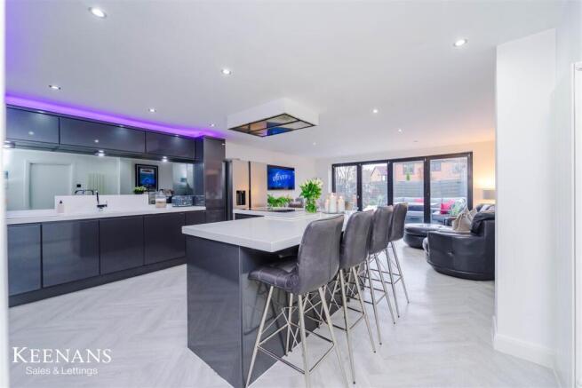 Kitchen/Dining Area - 7.06m x 4.60m (23'2 x 15'1 ) - UPVC double glazed window, upright central heating radiator, range of high gloss wall and base units with Corian work surfaces, Corian one and a half sink and drainer with mixer tap, two integrated high rise electric ovens with integrated microwave and warming drawer, five ring induction hob and extractor hood, integrated wine cooler and dishwasher, space for American-style fridge freezer, central island with breakfast bar, spotlights, plinth lighting, television point, wood effect laminate flooring with partial underfloor heating, door to utility and aluminium double glazed bi-folding doors to rear.