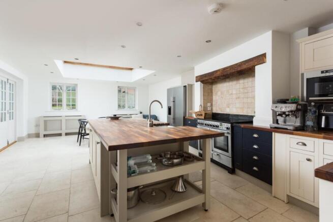 The kitchen dining room is an extremely spacious room, boasting a range of wall and base units, solid wood worktops as well as a stunning large kitchen island with breakfast bar. The kitchen also benefits from a Belfast sink, Rangemaster electric oven, freestanding fridge freezer and dishwasher. The large dining area is flooded with natural light by a stunning glass lantern ceiling.