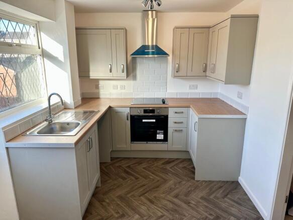 Modern Dining Kitchen: Recently refurbished with stylish cabinetry, wood-effect worktops, integrated oven and hob, and ample space for dining. Rear door opens to the garden.