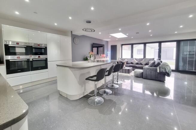 OPEN PLAN KITCHEN INC. SEATING & DINING AREA 24' 4" x 23' 2" (7.42m x 7.06m) Decreasing to 18'7" Large understairs storage cupboard, door to boiler room and cloakroom, gloss tiled flooring.