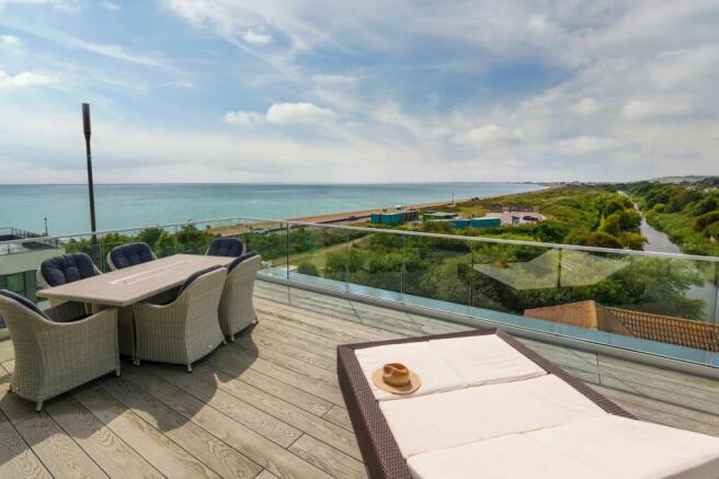 Immerse yourself in luxury coastal living with this stunning newly constructed penthouse apartment, where luxury, design, and breathtaking views converge. Don't miss the opportunity to make this extraordinary residence your own. Offering an expansive 250 square meters of living space within a gated community. Accessible via a smart lift, this residence promises exclusivity and convenience from the moment you arrive. On entering the apartment, you will be captivated by the stylish entrance hall leading to a spacious reception area, bathed in natural light from a striking feature roof light window. The open plan living area is a true masterpiece, showcasing panoramic views of the English Channel and the historic Royal Military Canal extending towards Hythe. Large frameless glass doors seamlessly connect the indoos with a sizable sun terrace, maximising the breathtaking coastal vista and inviting outdoor relaxation. The luxury bespoke 'Tom Howley' kitchen is a culinary delight, equipped with high-end 'Wolf' ovens, a substantial Sub-Zero wine fridge with backlit freezer drawers, and matching fridge units. A separate utility room houses essential appliances, including a washing machine and air pump tumble dryer. The apartment offers versatile spaces, including a study that doubles as a potential fourth bedroom. The master suite is a private oasis, featuring a beautifully appointed bedroom, en suite bathroom, and a private sun terrace. Two additional guest suites offer built-in wardrobes, en suite bathrooms, and an extra sun terrace accessible from the third bedroom. Modern comforts abound with gas-fired underfloor heating and luxurious floor coverings ranging from porcelain marble effect tiling to deep pile carpets in the bedrooms. The doors and skirting boards crafted by 'Deuren' add a touch of elegance. Outside, under the building, is a garage with two allocated parking spaces, bike storage, a storage cupboard, and a bin storage area. Communal gardens at the rear of the block provide a serene outdoor retreat.