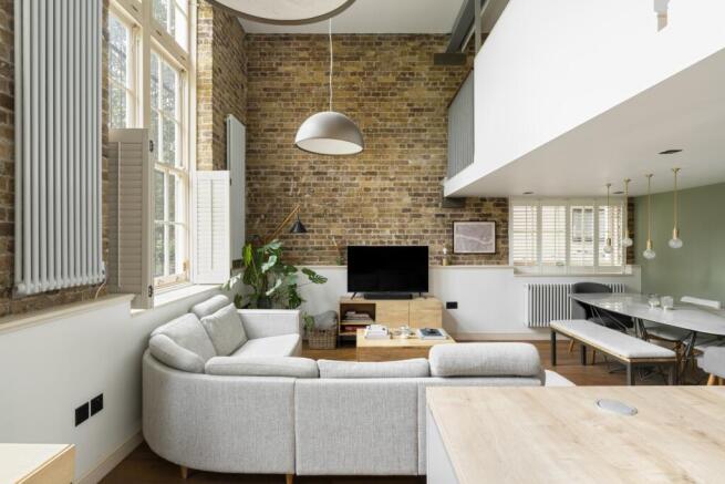 The double height open plan living space extends the full width of the building and is anchored by two large original sash windows, which draw in natural light throughout the day. At one end, a bespoke kitchen with an island and integrated appliances sits alongside a dedicated dining and seating area. Exposed brickwork, column radiators, built-in joinery, including fitted shelving and cabinetry, and carefully selected pendant lighting speak to the building’s industrial heritage while adding warmth and texture. A double bedroom and a shower room with contemporary fittings complete this level.