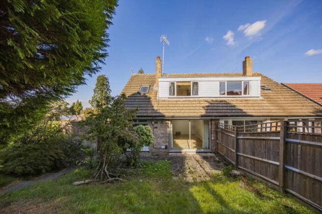 OUTSIDE REAR: To the rear of the property is a large lawned garden with fencing to one side and mature hedging to the front.